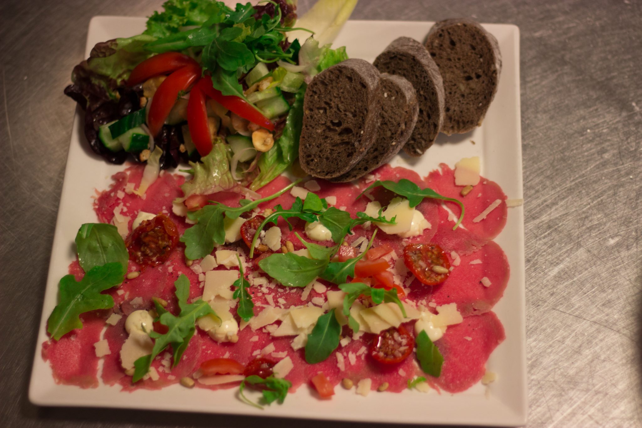 Een smaakvolle carpaccio van een mooi stukje rundvlees van het Blanc Bleu Belge Rund, met een fijne truffel mayonaise en vlokken Parmezaanse kaas.