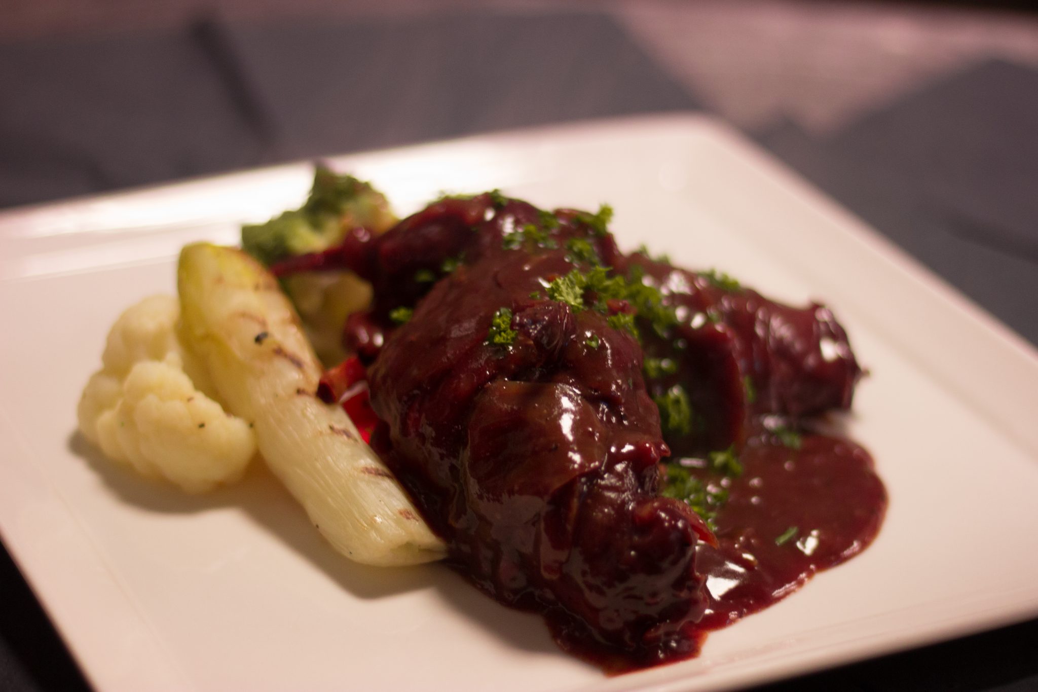 Gestoofd met diverse kruiden, specerijen, stroop en uien in Gerardus Dubbel bier uit Wittem
